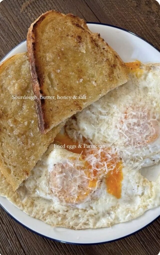 A breakfast that I enjoy on repeat all the time: Easy Over Eggs, Sourdough Bread usually with butter but adding honey tastes like a treat. Adding more protien to this because this is only 17g of protein so either add cottage cheese, yogurt or breakfast meats to the side.
